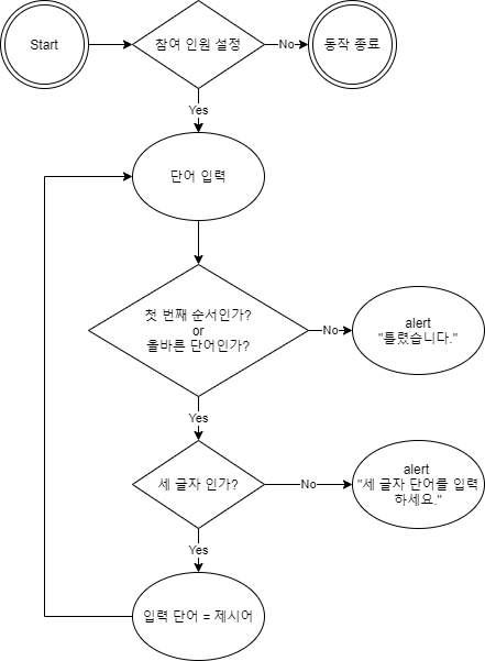 - 이전 단어의 끝과 다음 단어의 시작 글자가 일치해야 한다.