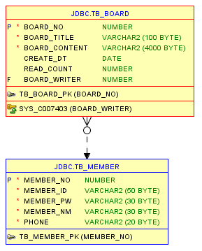- 회원 테이블 (TB_MEMBER)과 게시판 테이블(TB_BOARD)을 사용해 회원제 게시판의 형태를 만들었다.